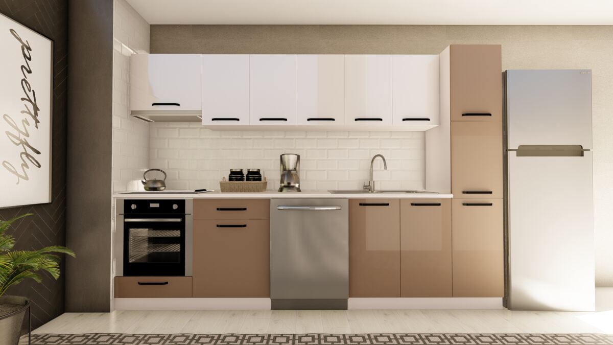 VİSAS CONCEPT _ 300 cm ALMİRA HAZIR MUTFAK DOLABI ASPİRATÖR, ANKASTRE ve KİLER MODÜLLÜ PARLAK BEYAZ ve CAPPUCCİNO