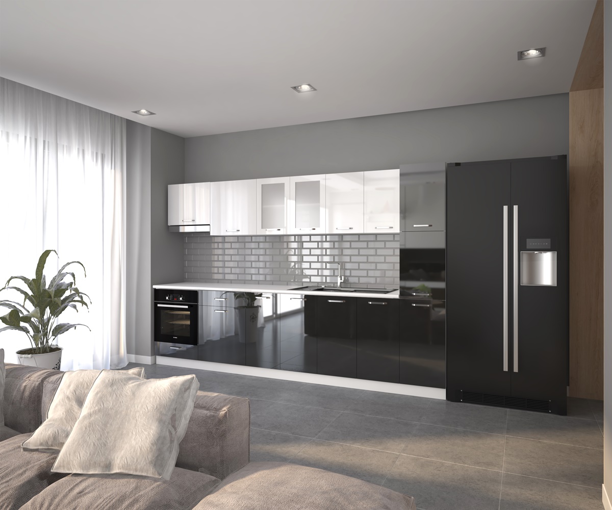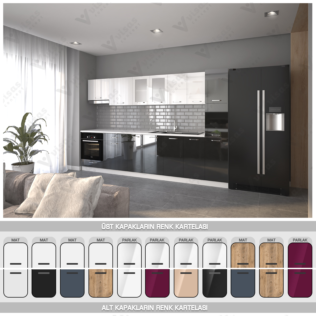VİSAS CONCEPT_GÜLER HAZIR MUTFAK DOLABI_Parlak HIGH-GLOSS_Kiler, Ankastre ve Aspiratör Modüllü_Cam Kapaklı_Beyaz ve Siyah_320 cm